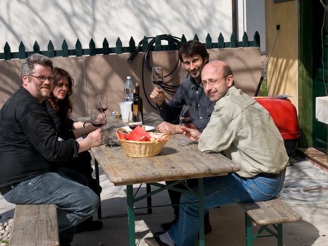 Die Wettergötter waren uns gnädig und ermöglichten es uns, die Weinverkostung bei Thomas Kitzmüller (rechts hinten) im Freien abzuhalten. Hier labt sich die Runde an einem gepflegten Cabernet Franc.